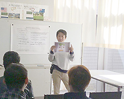 「ホットドッグの作り方」をテーマにした遠藤憲行さん(総合政策学部3年生)は、実際に自分が料理したホットドッグの写真を示しながら話し、調理の過程がわかりやすく、楽しくスピーチが聞けました。