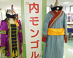 展示では、内モンゴルの自然や生活、家庭料理やモンゴル相撲の写真のほか、民族衣装や教科書、羊の皮で作った工芸品などを並べ、中国・内モンゴルの文化を紹介しました。