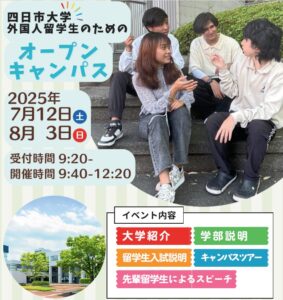 四日市大学の外国人留学生のためのオープンキャンパスは、 2025年7月12日(土)、8月3日(日)に開催します。 【受付】9:20~ 【開催】9:40~12:20
