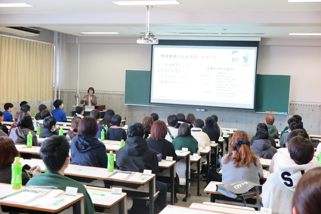 大学概要の説明、2学部の説明と在学生によるスピーチ、各学部より5クラス(経営戦略、公共政策、人文社会、環境科学、メディア情報)の模擬授業にて、各専攻の特徴的な授業を体験していただきました。