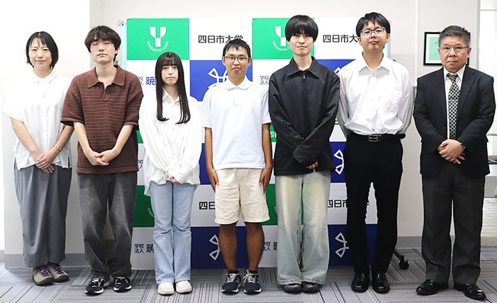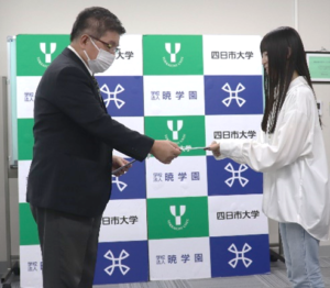 授与式は、10月1日(水)12時40分から、情報センター(図書館)1階のラーニングコモンズにて、本補助金の実施者である四日市大学学会会長の中西紀夫先生(写真右端)、担当教員の青木陽子先生(写真左端)、さらには学会役員のフェリペ フェハーリ先生にも同席いただき開催されました。