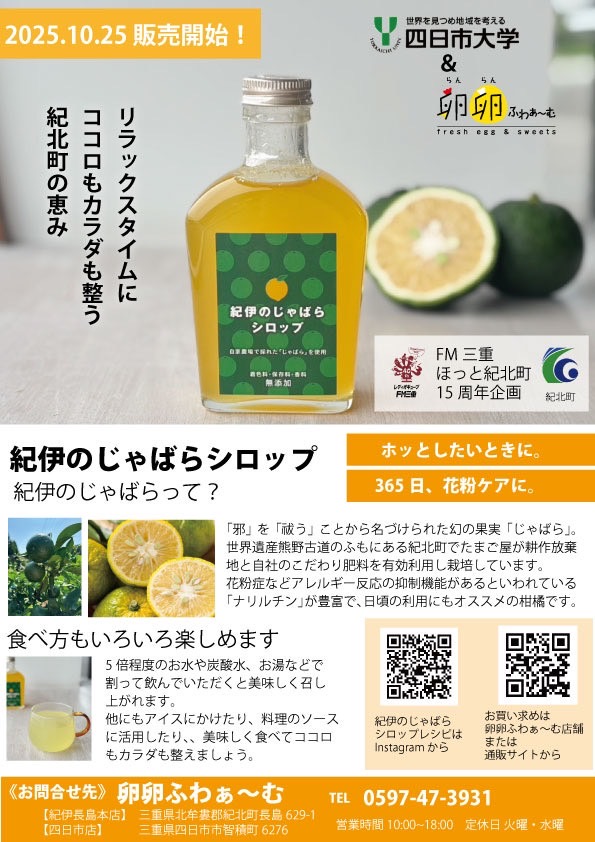 このプロジェクトは、総合政策学部の学生とラジオキューブFM三重、卵卵ふわぁ〜む(スイーツの製造販売)、紀北町とがタッグを組み、昨年より始動したものです。