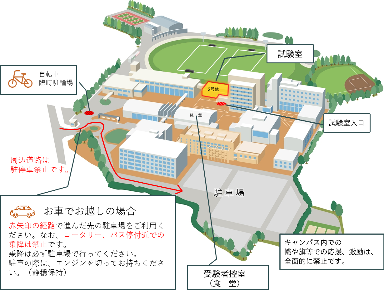 ・試験当日、周辺道路では、混雑が予想されます。出来る限り公共交通機関をご利用ください。